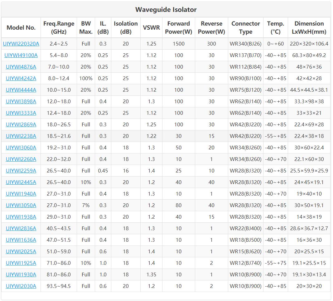 UIY Waveguide Isolators provide multiple size options, high frequency band and wide frequency range (2.4Ghz-110GHz.). Meanwhile, we provide flexible customization to project requirements.