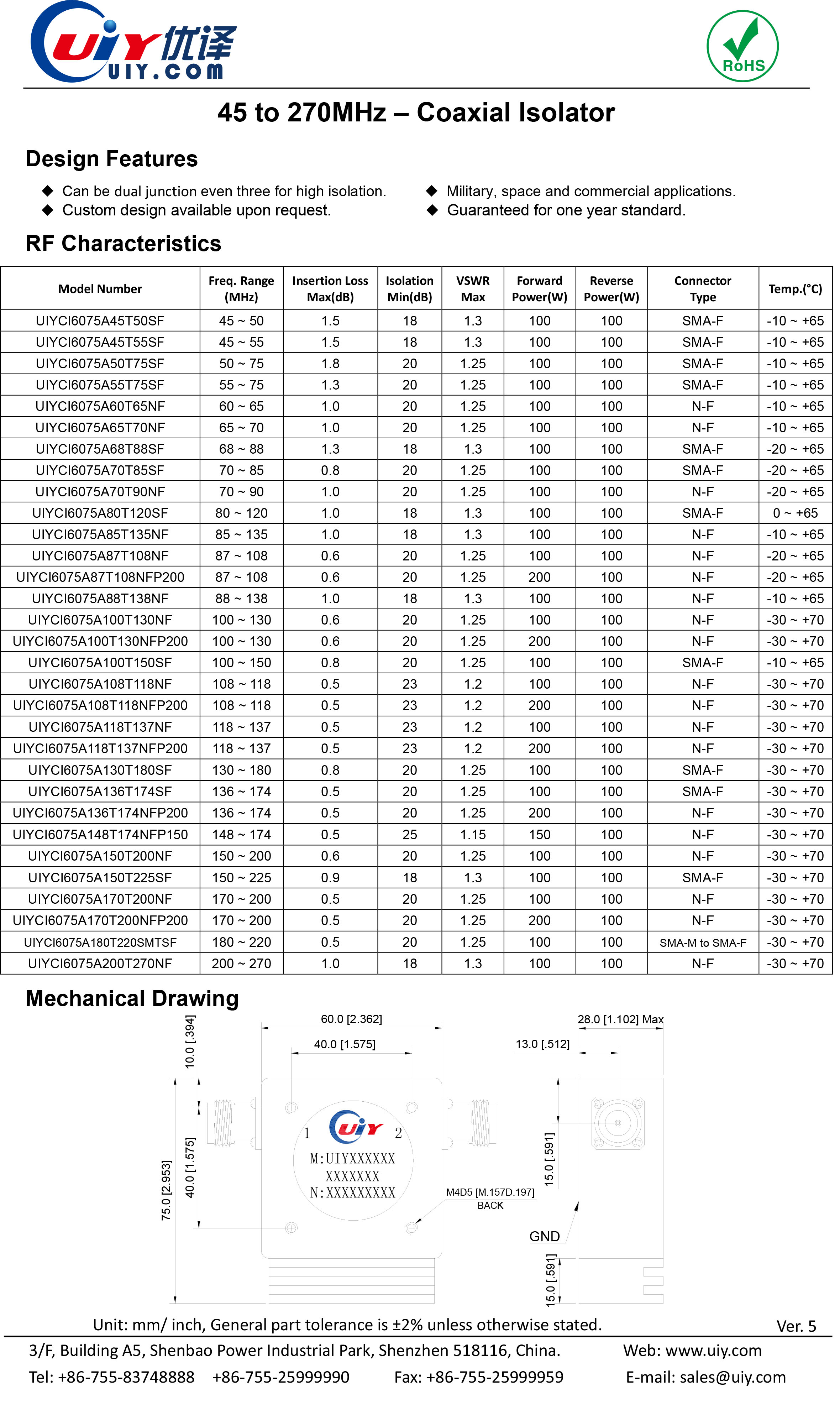UIYCI6075A 45~270 40% 0.35 23 1.2 200 100 N, SMA -30~+70 60×75×28