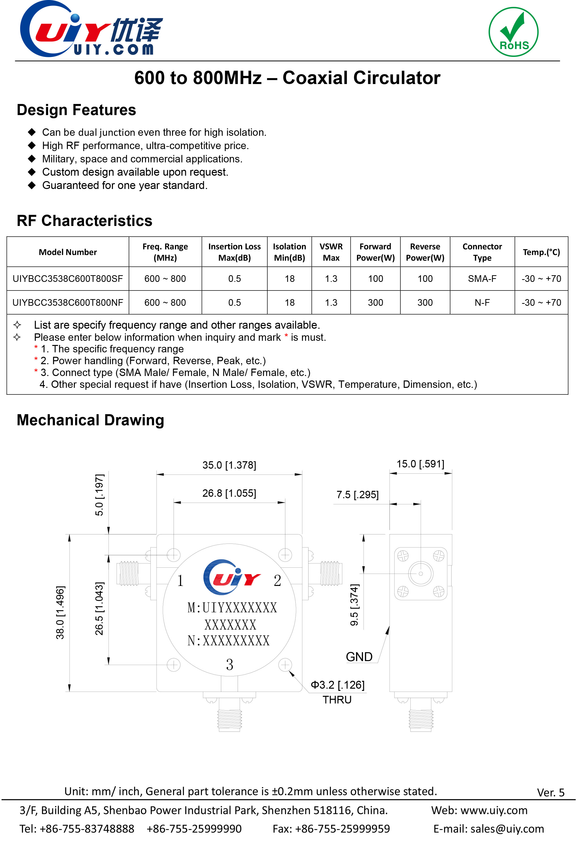 UIYBCC3538C600T800SF, UIYBCC3538C600T800SF 宽带同轴环形器 600-800MHz