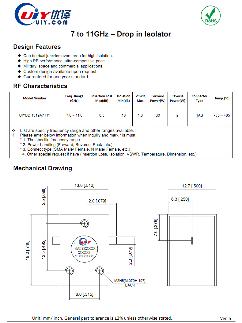 UIYBDI1319A7T11 宽带带线隔离器 7-11GHz 由于产品较多,如有未列出的或涉及到产品频率、指标参数、功率、接头形式等方面疑问,请致电或者细询在线客服。 电话: 0755-25999909 传真: 0755-25999959 邮箱: sales@uiy.com sales@uiy.com.cn 上一篇:UIYWI2445A30T31 波导隔离器 频率范围:30-31GHz 下一篇:同轴隔离器 UIYCI3546A 频率范围:300-930MHz